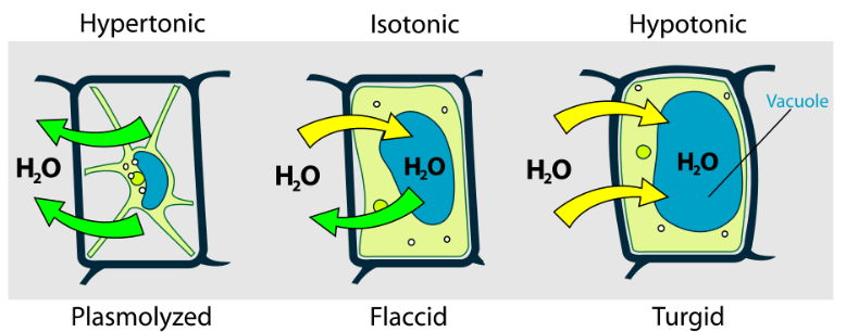 „Żywe organizmy roślinne (zwłaszcza te małe) wykorzystują ciśnienie turgorowe do utrzymywania stale tego samego kształtu komórek i kanałów międzykomórkowych. Roślina, której nie jest dostarczana wystarczająca ilość wody, więdnie (mięknie), ponieważ ciśnienie wewnętrzne jest zbyt niskie do zachowania jej świeżego kształtu” [1]. Mogą wystąpić tu trzy zjawiska: plazmoliza, równowaga i turgor (pełny).