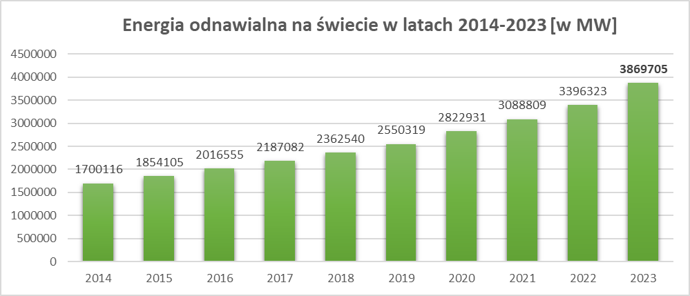 Energia odnawialna na świecie z roku na rok rośnie. Od 2014 roku do 2023 wzrosła o 128%. Widać tendencję wzrostową i raczej to się nie zmieni. W 2023 roku całkowita zainstalowana moc fotowoltaiczna po raz pierwszy przewyższyła moc energetyki wodnej, co stanowi przełomowy moment dla sektora energii odnawialnej. Dodatkowo 82% globalnych inwestycji w nowe źródła energii odnawialnej zostało zrealizowane w Chinach, Europie i Stanach Zjednoczonych, co potwierdza ich wiodącą rolę w przyspieszaniu transformacji energetycznej. W 2023 roku 134 kraje wykorzystywały systemy solarne, co dowodzi globalnej ekspansji tej technologii jako kluczowego elementu walki ze zmianami klimatycznymi i poprawy zrównoważonego rozwoju energetycznego.