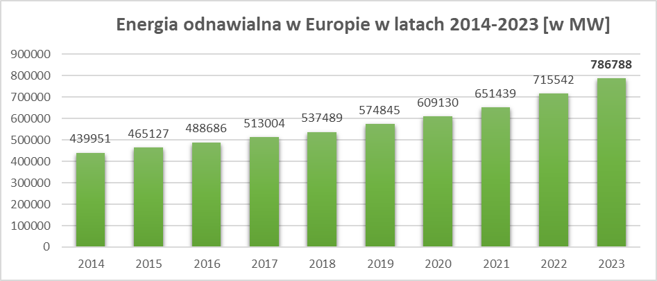 Tendencję wzrostową w mocy zainstalowanych OZE widać również w Europie. Wzrosła ona z 439 951 MW w 2014 roku do 786 788 MW w 2023 roku, co oznacza wzrost o 79%. „Hiszpania miała największą zainstalowaną moc CSP na świecie, wynoszącą 2,3 GW, a w 2023 r. elektrownie CSP dostarczyły do sieci około 5 TWh, czyli 2% zapotrzebowania kraju na energię elektryczną” – podaje raport REN21.
