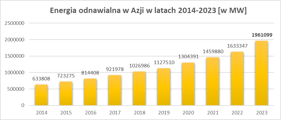 Każdy rok przynosił wzrost mocy zainstalowanej. Największe przyrosty nastąpiły po 2019 roku. Między rokiem 2022 a 2023 nastąpił największy wzrost – z 1 633 347 MW do 1 961 099 MW (czyli o 327 752 MW). Od roku 2020 widać przyspieszenie tempa wzrostu, co może wynikać z większych inwestycji w OZE (odnawialne źródła energii), polityki klimatycznej i spadku kosztów technologii, takich jak panele fotowoltaiczne. Azja dynamicznie rozwija sektor energii odnawialnej. Wzrost ten wskazuje na silne zaangażowanie krajów azjatyckich w transformację energetyczną. Prawdopodobnie głównymi motorami wzrostu są Chiny i Indie, które inwestują w elektrownie słoneczne, wiatrowe i wodne. Jak podano w raporcie REN21 na koniec 2023 r. w Chinach znajdowało się 40 nowych projektów CSP na różnych etapach budowy i uruchamiania.