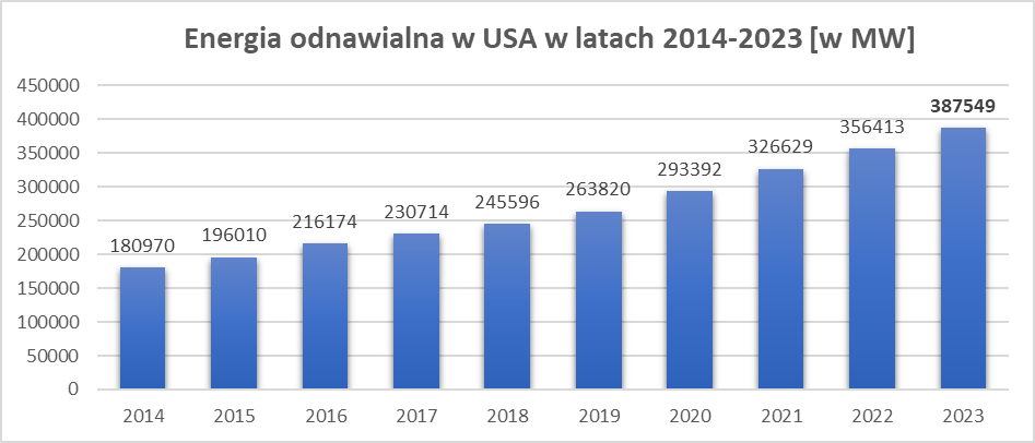 Wykres przedstawia rozwój mocy zainstalowanej energii odnawialnej w USA w latach 2014–2023, wyrażonej w megawatach (MW). W 2014 roku moc zainstalowana w OZE w USA wynosiła 180 970 MW. W kolejnych latach systematycznie rosła, osiągając w 2023 roku 387 549 MW. Oznacza to ponad dwukrotny wzrost w ciągu dekady.