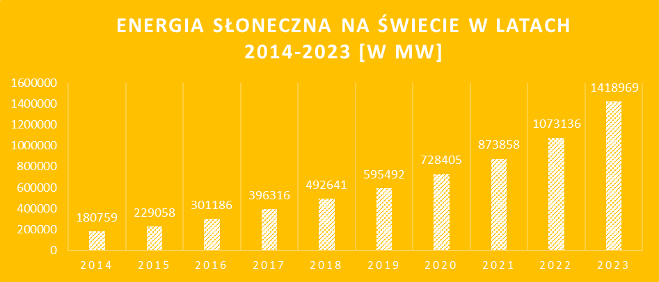 W 2014 roku światowa moc zainstalowana energii słonecznej wynosiła 180 759 MW, natomiast do 2023 roku wzrosła aż do 1 418 969 MW. Oznacza to ponad siedmiokrotny wzrost w ciągu zaledwie dziewięciu lat. Energia słoneczna stała się jednym z najszybciej rozwijających się źródeł odnawialnych na świecie, zwiększając swój globalny potencjał prawie 8-krotnie.