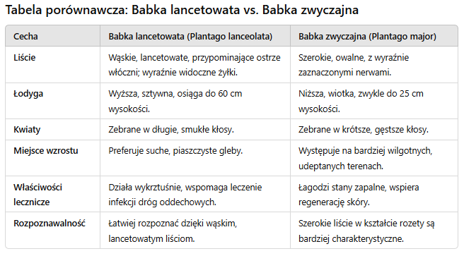 Pomimo podobnych właściwości leczniczych, babka lancetowata i zwyczajna różnią się zastosowaniem w terapii. Babka lancetowata jest bardziej ceniona w leczeniu schorzeń układu oddechowego, podczas gdy babka zwyczajna lepiej sprawdza się w gojeniu ran i łagodzeniu stanów zapalnych skóry. Wybór odpowiedniego gatunku pozwala lepiej dopasować właściwości rośliny do potrzeb.