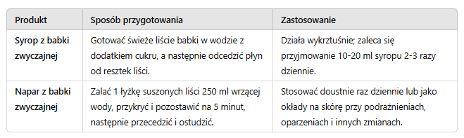 • Zastosowanie kulinarne: młode liście babki mogą być dodawane do sałatek, zup czy smoothie, wzbogacając potrawy o cenne składniki odżywcze.