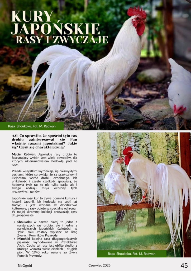 A na deser mamy dla Was wspaniały wywiad z Maciejem Radwanem — hodowcą kur japońskich w Polsce. Ponadto mamy dla Was także artykuł o ptakach w ogrodzie — czy warto je mieć, oraz o hortiterapii w szkole.